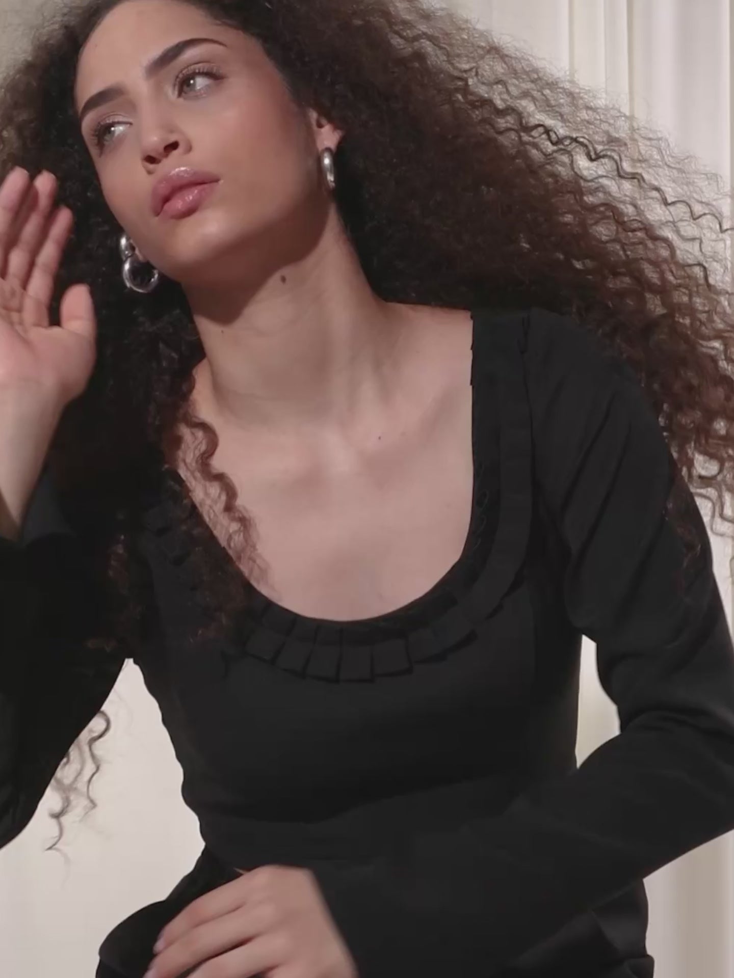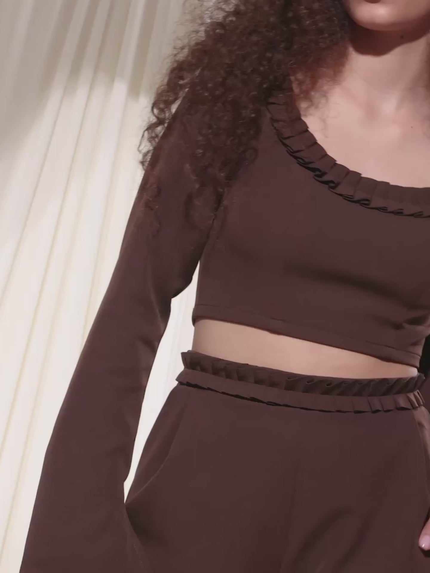 - Compuesto por un top de manga larga tiro alto con escote ovalado y detalles plisados.